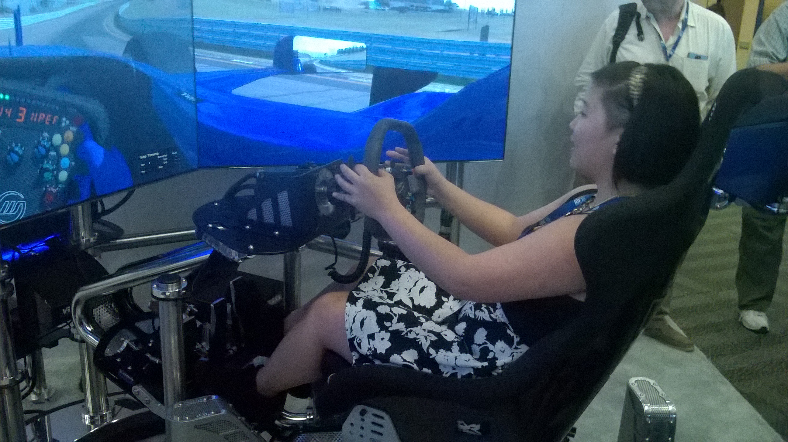 Even better than the maker stations were the RealSense exhibits. These exhibits were all about enhancing the Internet of Things (IoT) with haptics, sensors, cameras…you name it! I stood in front of a mirror where a virtual necklace was placed on the neck of my reflection. I drove (and crashed) a car simulation that professional drivers use to train! Excitedly I asked how much the apparatus costs. “$84,000,” he replied, and I filed this item away for a hypothetical future where I can afford things. Some folks were getting 3D images of themselves etched on glass. Yes, IoT and RealSense are indeed super cool.